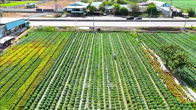 Cánh đồng hoa Tết tại xã An Cơ, huyện Châu Thành, tỉnh Tây Ninh với hơn 30 nghìn chậu hoa các loại, chuẩn bị cung ứng ra thị trường. Ảnh: Minh Phú/TTXVN