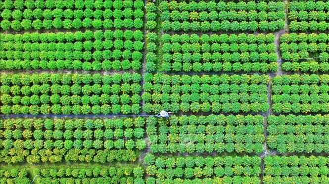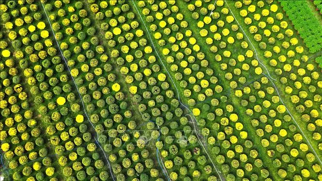 Vườn hoa ở xã Truông Mít, huyện Dương Minh Châu với hơn 20 nghìn chậu hoa vạn thọ chuẩn bị phục vụ thị trường hoa Tết Ất Tỵ 2025. Ảnh: Minh Phú/TTXVN