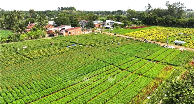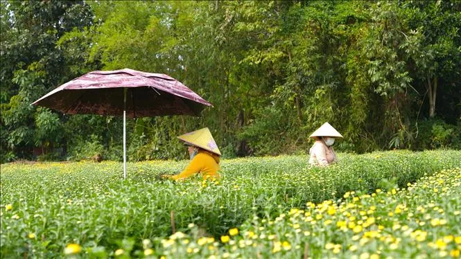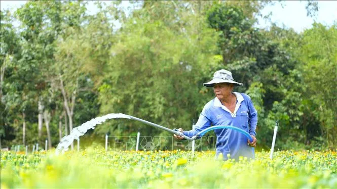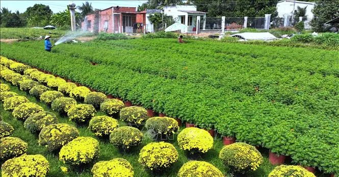 Người dân làng hoa An Cơ, huyện Châu Thành, tất bật chăm sóc hoa để kịp phục vụ cho thị trường Tết Nguyên đán Ất Tỵ 2025. Ảnh: Minh Phú/TTXVN