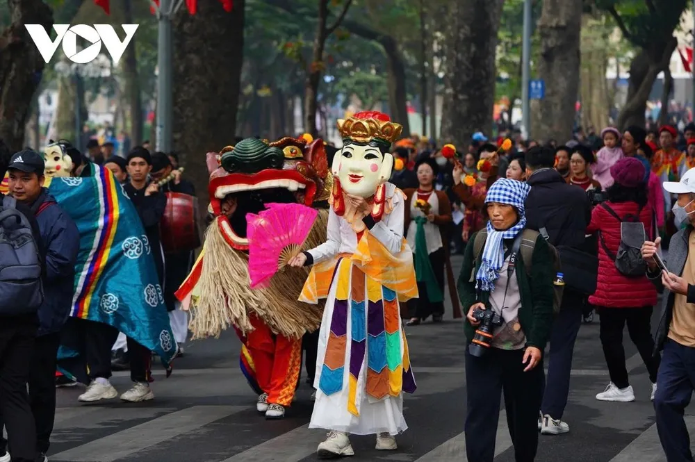 Đoàn rước với hàng trăm người tham gia đi qua các địa điểm nổi tiếng trên phố cổ Hà Nội