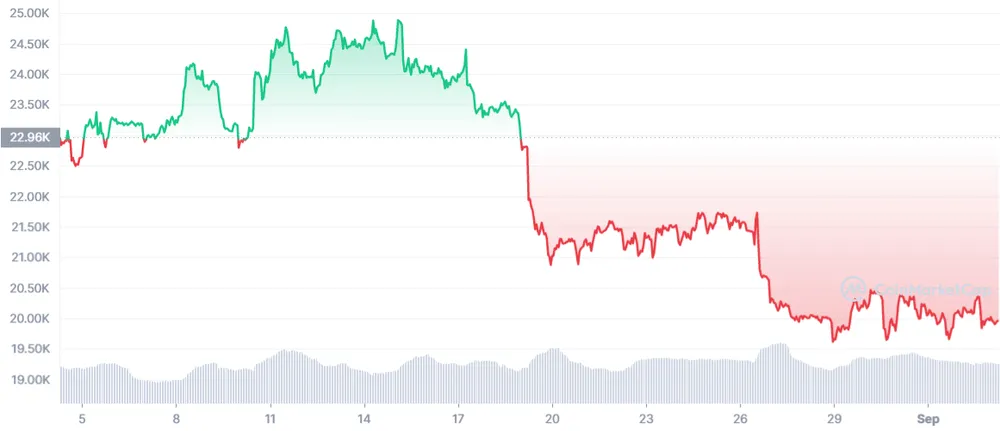 Vào thời điểm viết bài lúc 5:20 sáng hôm nay ngày 5-9, Bitcoin đang giao dịch ngay dưới mốc 20.000 USD ở mức 19.873 USD, tổng vốn hóa thị trường của Bitcoin là 380 tỷ USD, tỷ lệ thống trị là 38,8%.