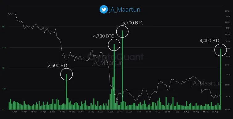 Hơn nữa, vào ngày 2-9 các thợ đào đã chuyển 4.400 BTC lên các sàn giao dịch, lịch sử có thể lặp lại. Có khả năng giá BTC sẽ giảm mạnh trong những ngày tới.