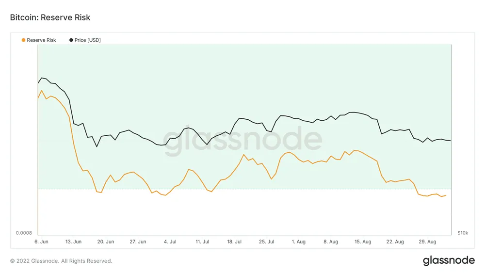 Hơn nữa, tỷ lệ Reserve Risk (dự trữ rủi ro) của Bitcoin cũng giảm đáng kể. Điều này có thể báo hiệu đáy thị trường cùng với việc tạo cơ hội tích lũy cho các nhà đầu tư khi tỷ lệ rủi ro/lợi nhuận tăng lên.