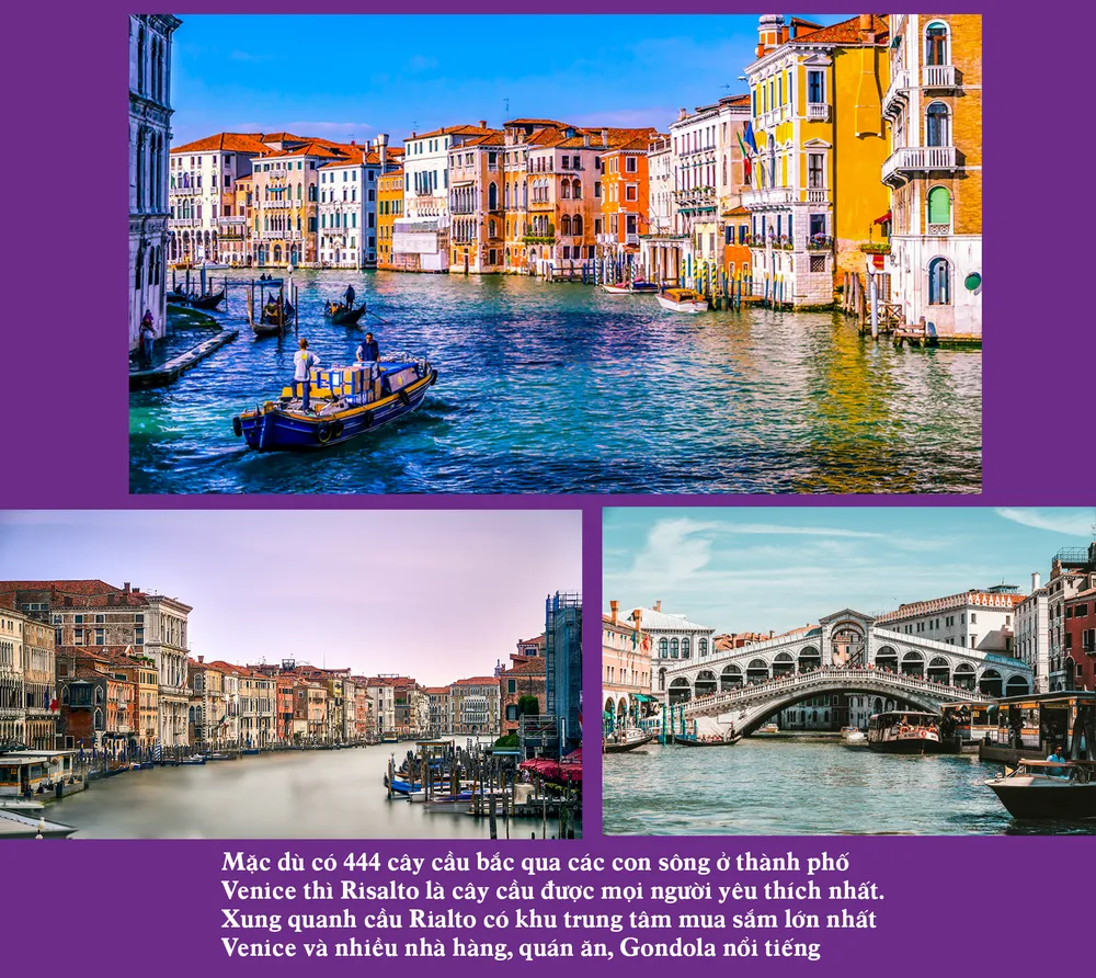 Cầu Rialto: Là địa danh nổi tiếng của Venice, cầu Rialto là một điểm giao cắt quan trọng của kênh đào. Cây cầu có hình dáng giống như chữ V ngược với dãy cuốn và thành cao bằng đá cẩm thạch độc đáo. Xung quanh cầu Rialto có khu trung tâm mua sắm lớn nhất Venice và nhiều nhà hàng, quán ăn, Gondola nổi tiếng. Mặc dù trong 444 cây cầu bắc qua các con sông ở thành phố Venice thì Risalto là cây cầu được mọi người yêu thích nhất.