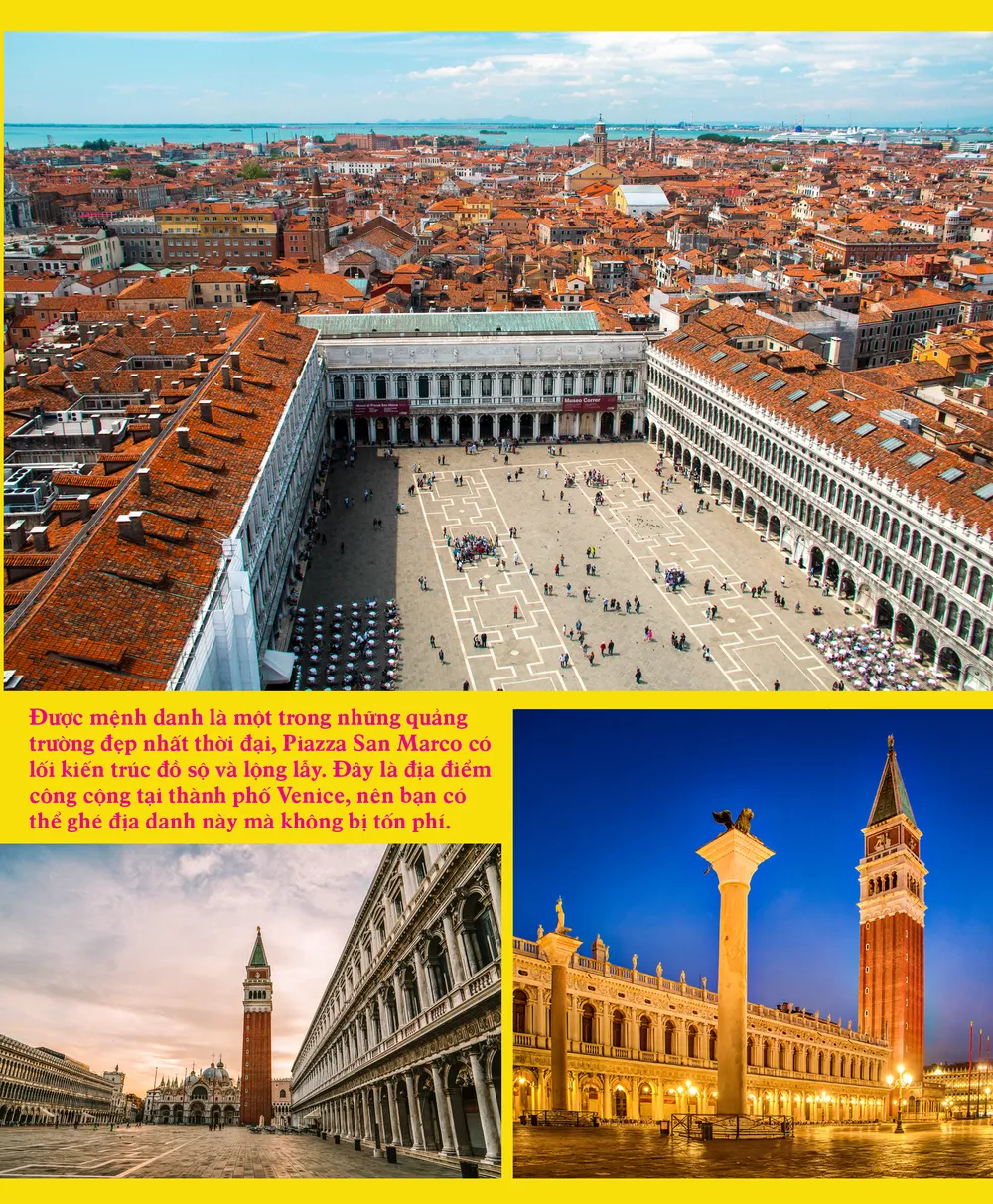 Quảng trường Piazza San Marco: Quảng trường Piazza San Marco là nơi tập trung nhiều du khách nhất khi đến Venice. Được mệnh danh là một trong những quảng trường đẹp nhất thời đại, Piazza San Marco có lối kiến trúc đồ sộ và lộng lẫy. Đây là địa điểm công cộng tại thành phố Venice, nên bạn có thể ghé địa danh này mà không bị tốn phí. Một số nơi tham quan gần khu vực quảng trường như: Dinh tổng trấn Palazzo Ducale, nhà thờ Thánh San Marco, tháp chuông St.Mark.