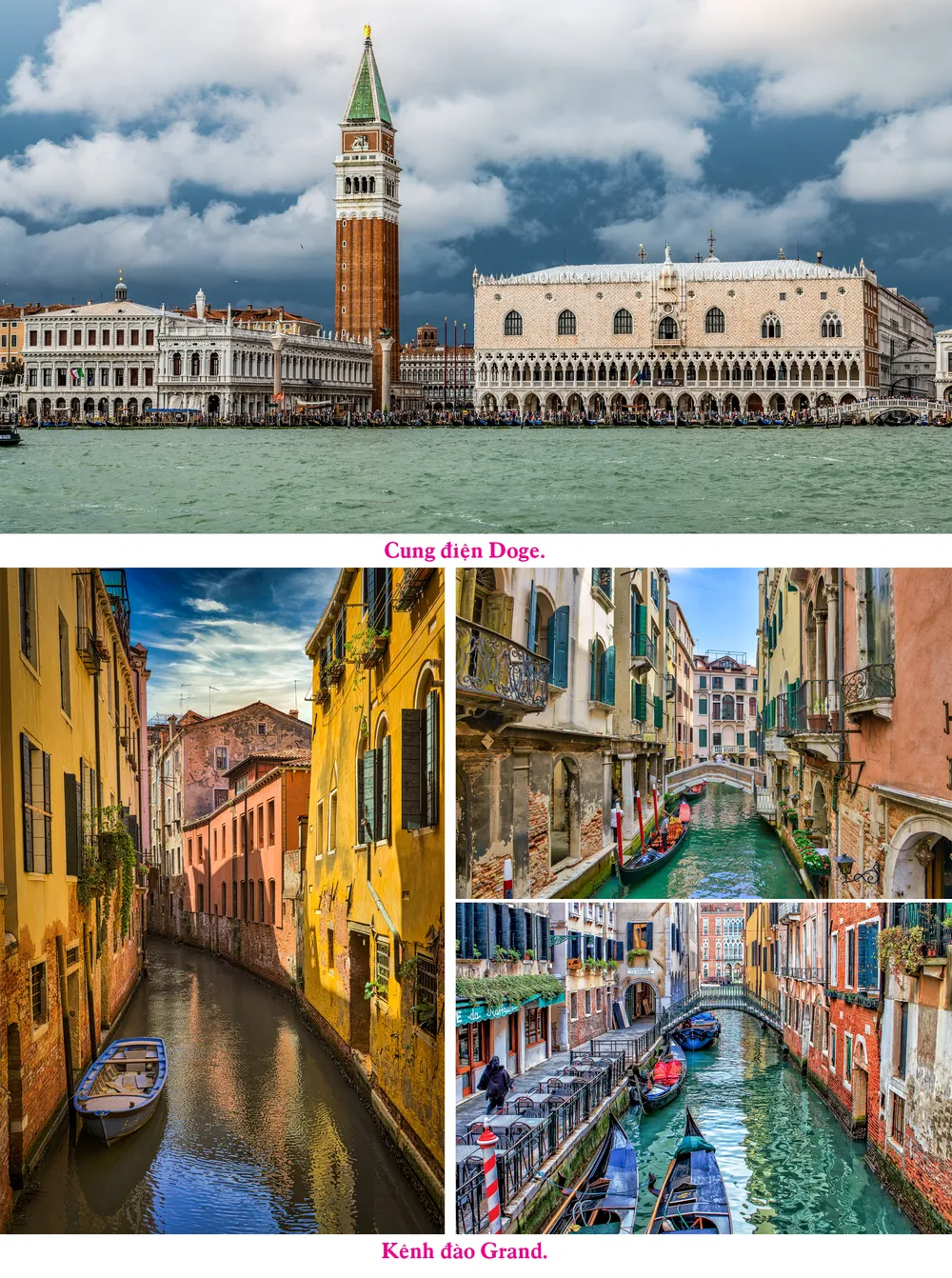 Kênh đào Grand: Đến thành phố của những kênh đào Venice mà không ghé tham quan kênh đào Grand là một điều nuối tiếc to lớn. Các con kênh đào ở Venice uốn quanh thành phố ngoằn ngoèo kết hợp với những cây cầu ngoạn mục tạo thành bức tranh vô cùng đẹp. Tận hưởng hoàng hôn, đi bộ một vòng và ngắm những dòng nước lấp lánh của con kênh là hoạt động nhiều khách du lịch thích nhất khi đến đây. Đến Venice bạn đừng bỏ lỡ một chuyến du ngoạn có 102 từ chiếc thuyền Gondola đặc trưng để ngắm nhìn khung cảnh và kiến trúc Venice tuyệt tác nhé.