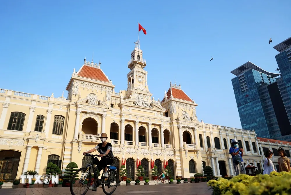 Trụ sở Hội đồng Nhân dân, Ủy ban Nhân dân Thành phố Hồ Chí Minh sáng đầu năm mới 2024. (Ảnh: Hồng Đạt/TTXVN)