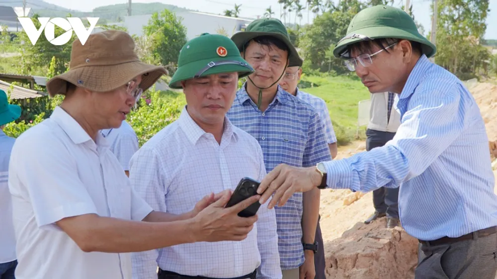 Ông Nguyễn Việt Hùng, Thứ trưởng Bộ Xây Dựng (thứ 2 từ trái qua) kiểm tra khu vực nhà dân bị ảnh hưởng do địa phương và chủ đầu tư cung cấp