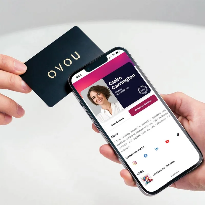 Bạn không muốn những chiếc danh thiếp cồng kềnh trong túi, hãy thử chia sẻ thông tin cá nhân cùng OVOU. Không bao giờ phải lo lắng về việc hết danh thiếp nữa. Với OVOU, người dùng có khả năng chia sẻ thông tin không giới hạn. Danh thiếp thông minh OVOU lưu thông tin liên lạc của người dùng trực tiếp vào điện thoại của đối phương.