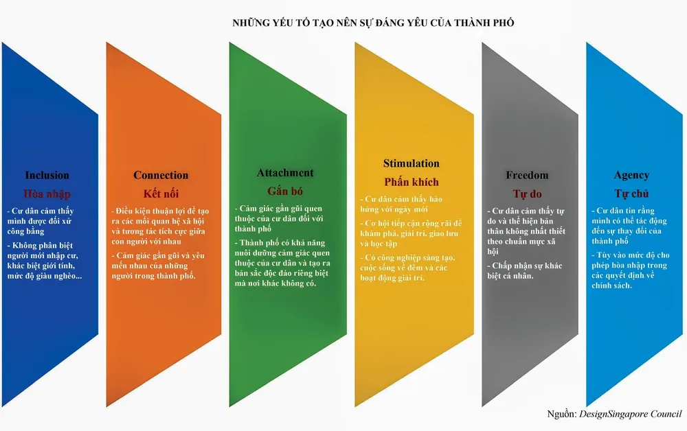 Từ kết quả của các cuộc khảo sát và hội thảo, dự án đã phát triển khung khái niệm được gọi là “Khuôn khổ của tính đáng yêu”. Theo đó, khi chúng ta nghĩ về cảm nhận của mình về thành phố, 4 chủ đề/khía cạnh chính thường xuất hiện trong đầu với những chiều kích.