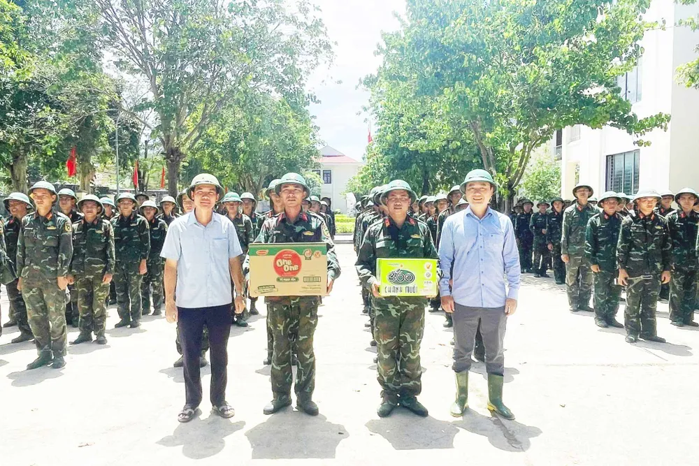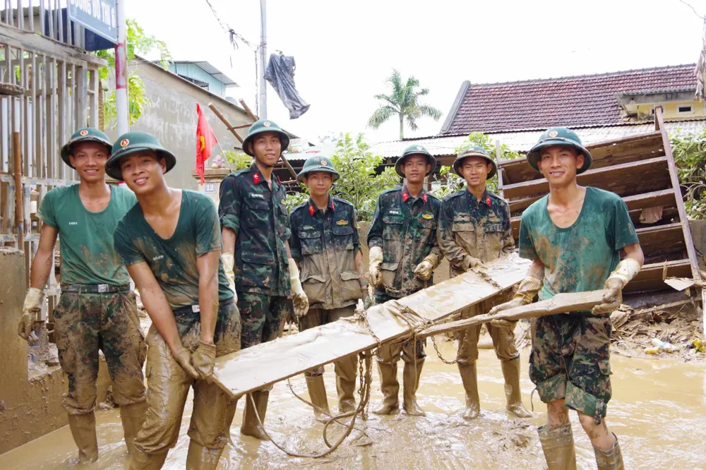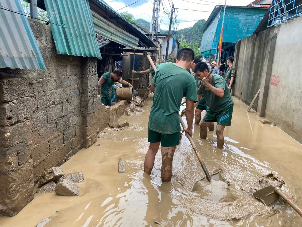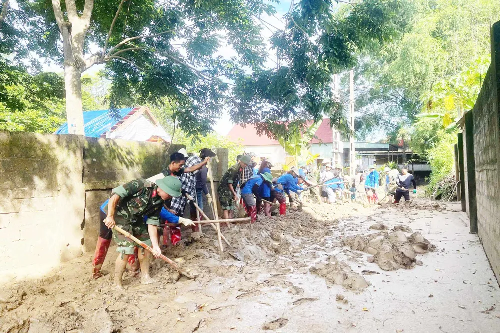 Cán bộ, chiến sĩ Trung đoàn 335, Sư đoàn 324 cùng đoàn viên thanh niên và nhân dân xã Con Cuông dọn bùn đất sau mưa lũ