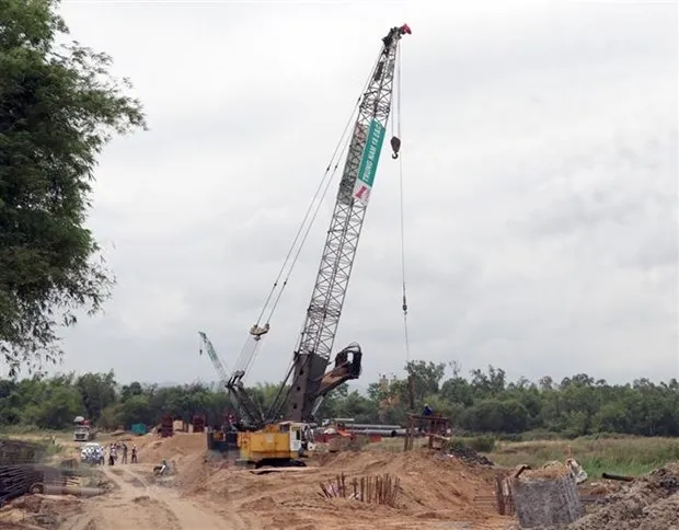 Thi công trụ mố cầu vượt sông Đà Rằng trên cao tốc Bắc-Nam, phấn đấu hoàn thành trước mùa mưa. (Ảnh: Xuân Triệu/TTXVN)