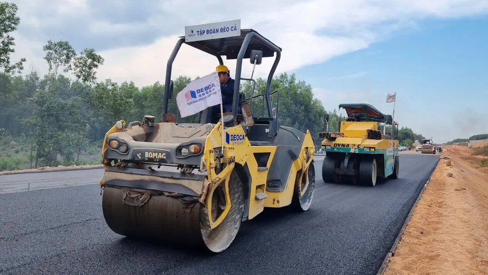 Tại gói thầu XL1, đoạn qua xã Hành Thuận (huyện Nghĩa Hành, tỉnh Quảng Ngãi), các kỹ sư, công nhân đang tiến hành trải thảm những mét bê tông nhựa. Nhà thầu đã huy động 3 giàn thảm bê tông nhựa với mỗi giàn gồm 1 máy rải, 4 máy lu, 30 xe vận chuyển bê tông nhựa. Nhựa trải đến đâu, các công nhân điều khiển xe lu đến đó.