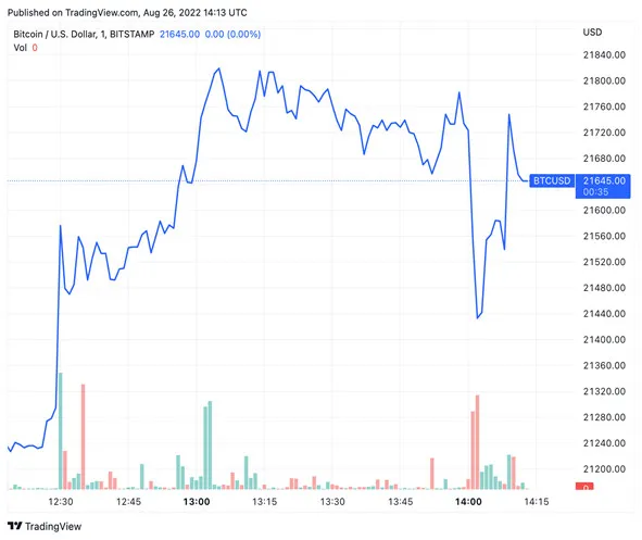 Giá tiền điện tử đã tăng trước khi bài phát biểu của Chủ tịch Fed Jerome Powell tại hội nghị Jackson Hole, Wyoming diễn ra. Bitcoin giao dịch cao hơn so với mốc 21.800 USD và Ethereum tăng trên 1.700 USD. Nhưng giá các đồng coin đã giảm nhanh khi chủ tịch Fed chia sẻ các đồng nghiệp của mình dự báo lãi suất trung bình dưới 4% vào cuối năm.