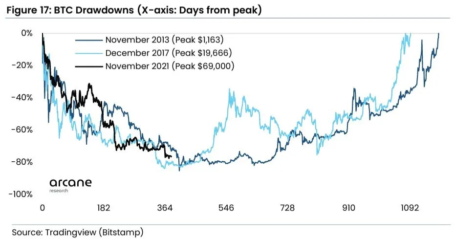 Trong báo cáo “Đón đầu xu hướng” gần đây, Arcane Research quan sát thấy rằng chu kỳ gấu này hiện khớp với các chu kỳ trong năm 2014 và 2018 về thời gian kéo dài.