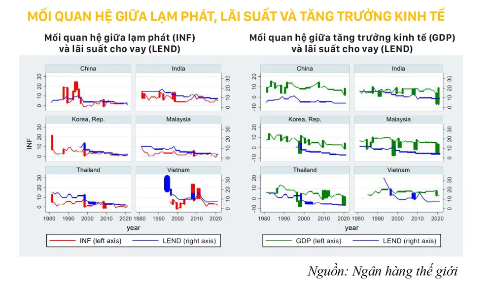 Do đó, điều hành CSTT cần có sự phối hợp hài hòa và hiệu quả với chính sách ổn định tài chính. Xem xét mối quan hệ giữa lạm phát, lãi suất cho vay và tăng trưởng kinh tế của Việt Nam và một số nước trong khu vực, có thể nhận thấy việc duy trì được mặt bằng lãi suất ở mức hợp lý và ổn định sẽ giúp nền kinh tế duy trì được tốc độ tăng trưởng tốt hơn.