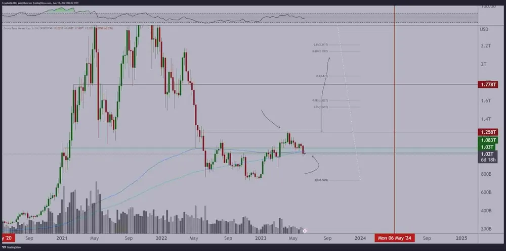 Vào thứ Hai (12-6), Michaël van de Poppe, một chuyên gia về tiền điện tử được nhiều người theo dõi, đã chỉ ra một ngưỡng quan trọng mà tổng vốn hóa thị trường tiền điện tử toàn cầu phải phục hồi để tránh sụt giảm thêm.