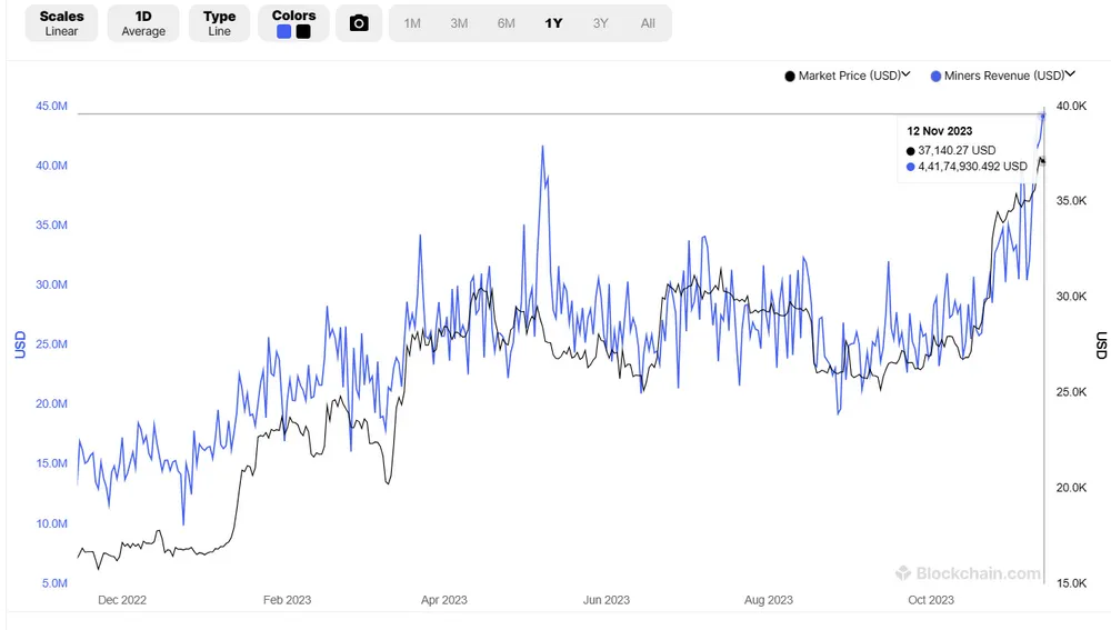 Vào ngày 12-11, phần thưởng khai thác Bitcoin hàng ngày đã vượt qua 44 triệu USD lần đầu tiên vào năm 2023. Theo dữ liệu từ blockchain.com, con số này được nhìn thấy lần cuối vào tháng 4-2022.