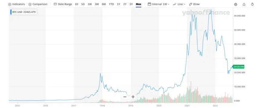 Từ khi đạt đỉnh vào tháng 2-2022 và lao xuống mức thấp nhất vào tháng 6-2022, chỉ số S&P 500 giảm từ 4,504 xuống còn 3,667, tương đương -18,6%. Đồng thời, Bitcoin đã lao từ mức đỉnh 69.000 USD xuống còn 19.018 USD (-56,7%).