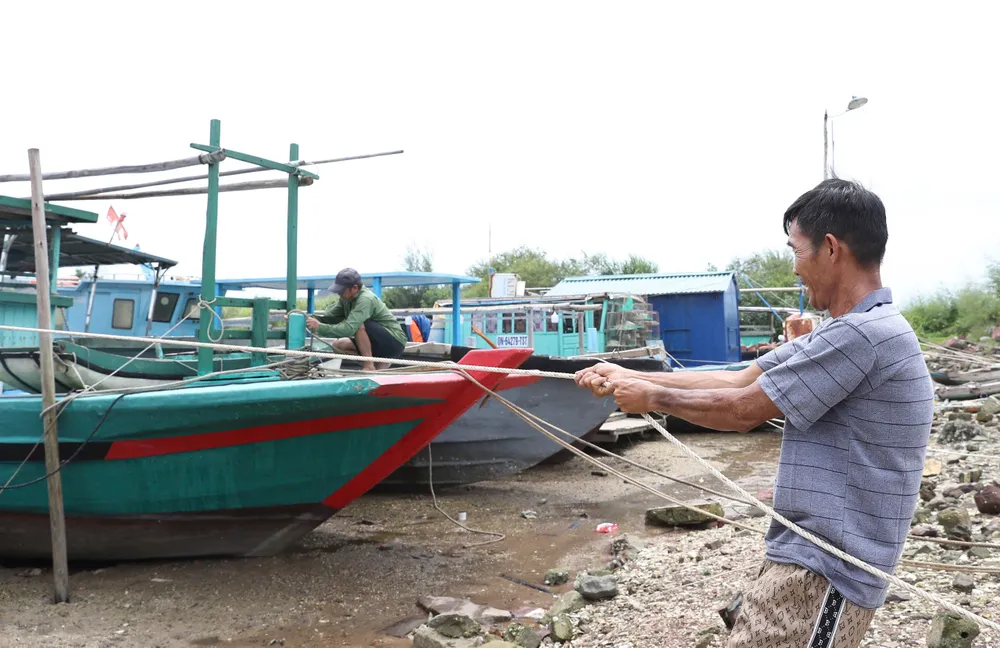 Ngư dân Bùi Văn Nhất kéo tàu lên bờ, neo buộc tránh bão. Ảnh: QUANG PHÚC