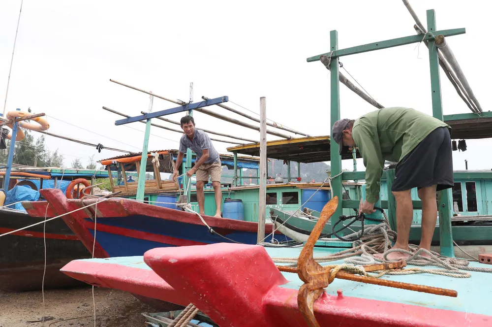 Trên bến cá Tống Bình ở tổ 14, phía Bắc thị trấn Cái Rồng, ngư dân đang khẩn trương chằng, buộc các con tàu vào bờ và neo với nhau để tránh sóng đánh, va đập khi bão đổ bộ vào.