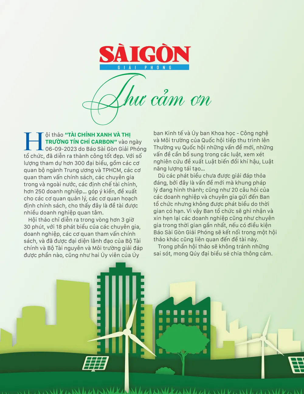 Thư cảm ơn từ Ban tổ chức hội thảo 'Tài chính xanh và thị trường tín chỉ Carbon"