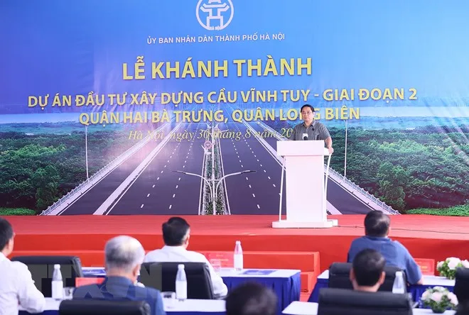 Thủ tướng Phạm Minh Chính phát biểu tại Lễ Khánh thành Cầu Vĩnh Tuy giai đoạn 2. (Ảnh: Dương Giang/TTXVN)