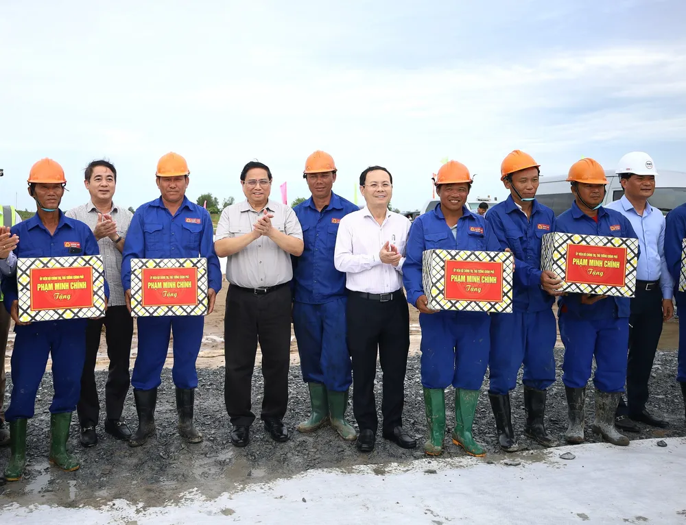 Thủ tướng Phạm Minh Chính và Bí thư Thành ủy TP Cần Thơ Nguyễn Văn Hiếu tặng quà đến công nhân đang thi công tuyến cao tốc trên địa bàn huyện Vĩnh Thạnh