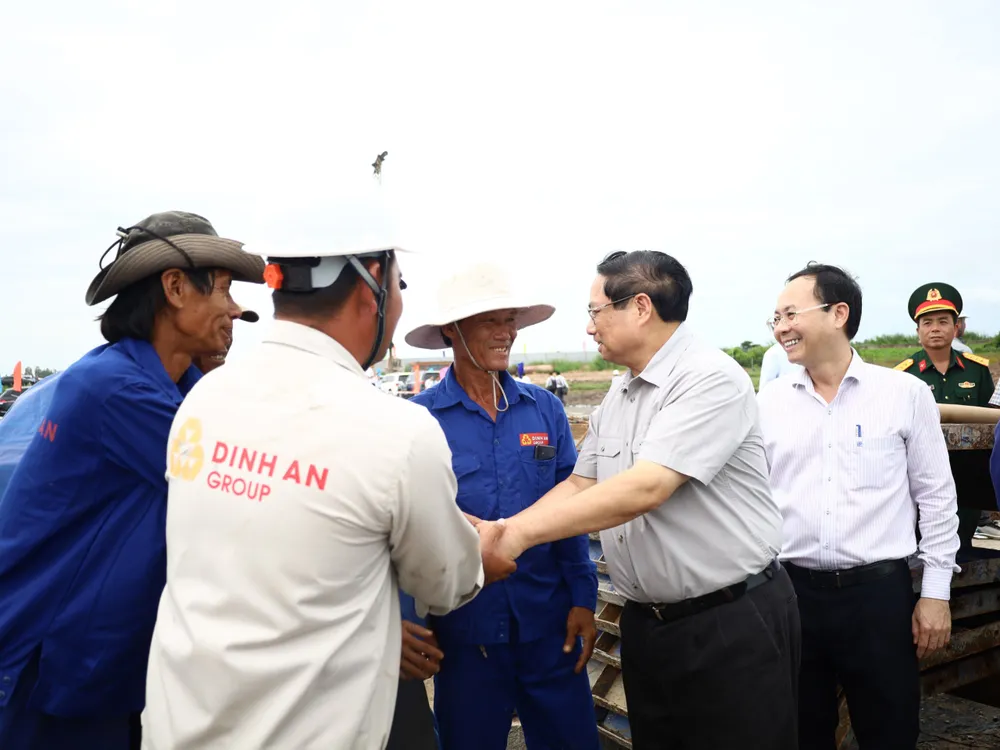 Thủ tướng Phạm Minh Chính thăm hỏi và động viên các công nhân đang thi công trên tuyến cao tốc Châu Đốc - Cần Thơ - Sóc Trăng
