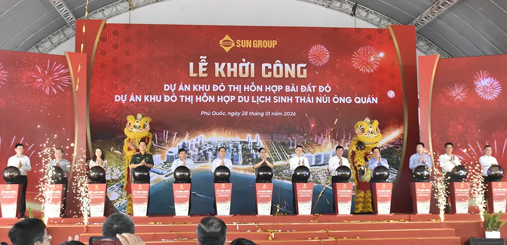 * Cũng trong sáng 28-1, UBND đặc khu Phú Quốc (tỉnh An Giang) phối hợp Tập đoàn Sun Group tổ chức lễ khởi công dự án Khu đô thị hỗn hợp Bãi Đất Đỏ và Khu đô thị hỗn hợp du lịch sinh thái núi Ông Quán – hai trong số 21 dự án hạ tầng chiến lược phục vụ Hội nghị APEC 2027 tại Phú Quốc.
