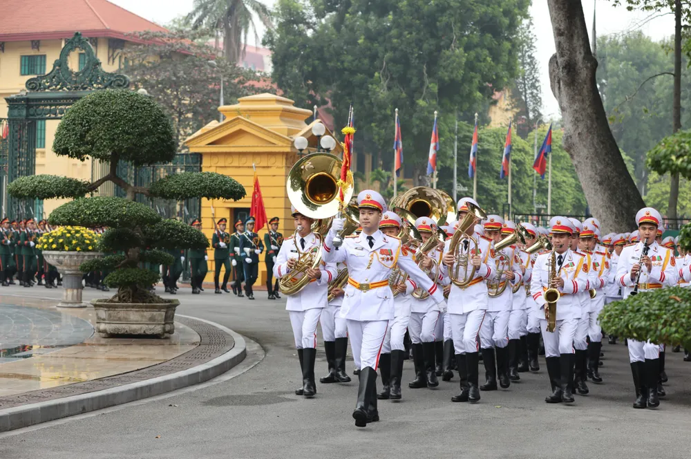 Thủ tướng Phạm Minh Chính và Thủ tướng Campuchia Samdech Moha Bovor Thipadei Hun Manet đã duyệt đội danh dự Quân đội nhân dân Việt Nam tại lễ đón chính thức.