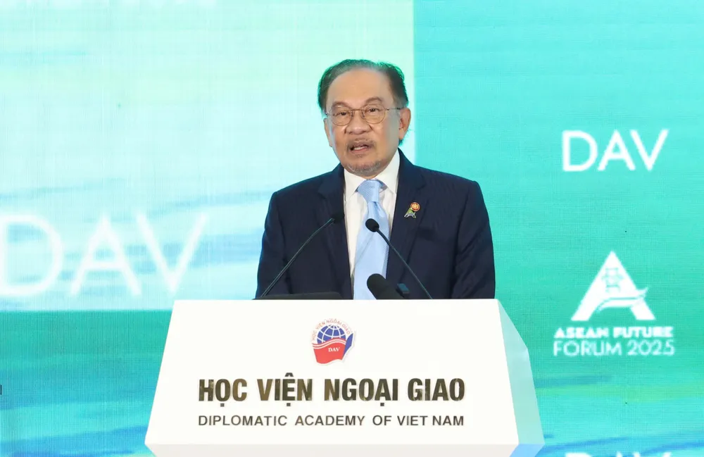 Thủ tướng Malaysia Anwar Ibrahim phát biểu tại phiên toàn thể cấp cao Diễn đàn Tương lai ASEAN 2025, sáng 26-2. Ảnh: QUANG PHÚC