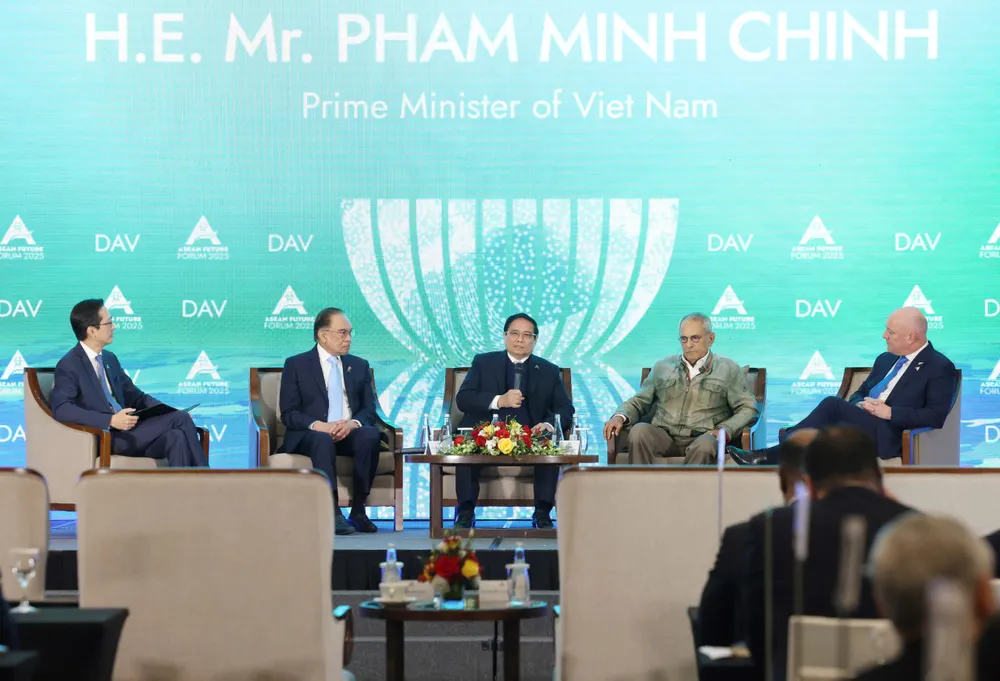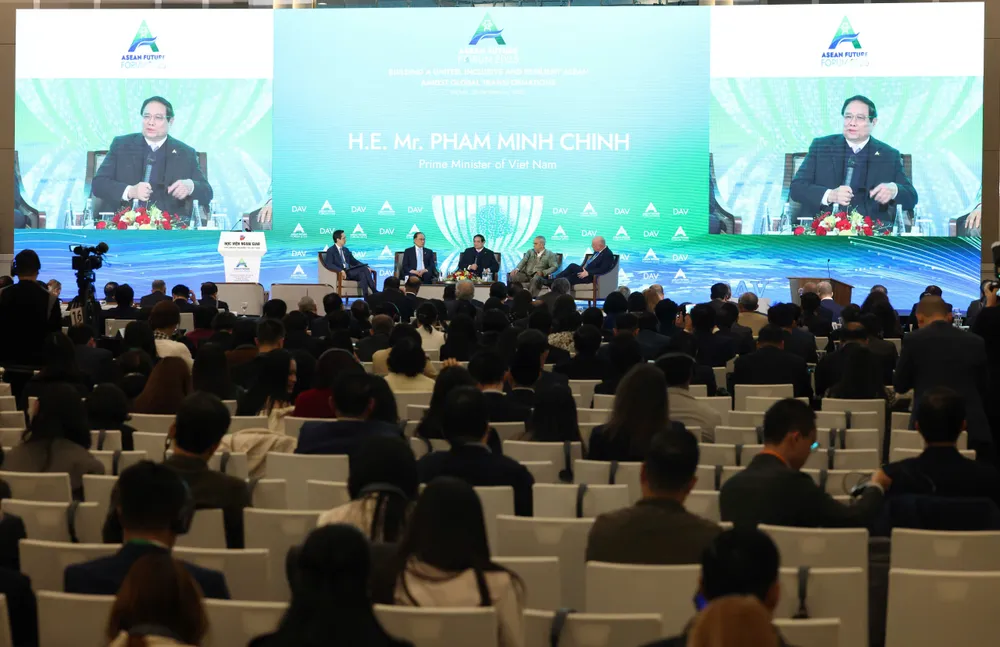 Thủ tướng Phạm Minh Chính, Tổng thống Timor-Leste José Ramos-Horta, Thủ tướng Malaysia Anwar Ibrahim và Thủ tướng New Zealand Christopher Luxon trao đổi với các đại biểu tại phiên toàn thể cấp cao Diễn đàn Tương lai ASEAN 2025, sáng 26-2. Ảnh: QUANG PHÚC