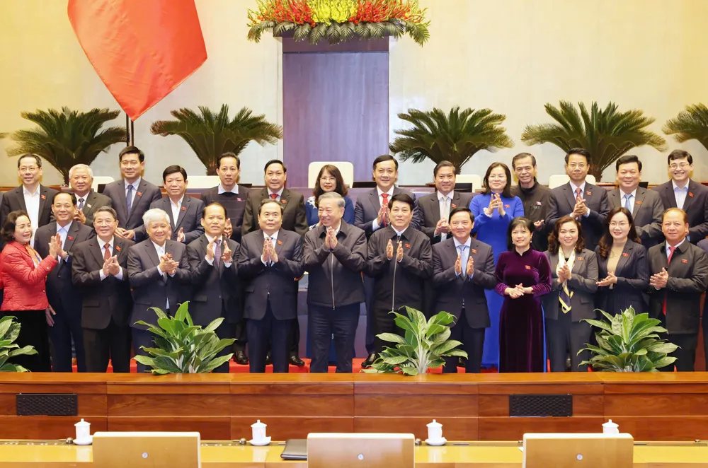 Tổng Bí thư Tô Lâm, Chủ tịch nước Lương Cường, Chủ tịch Quốc hội Trần Thanh Mẫn và các đại biểu dự phiên họp tại hội trường Diên Hồng chiều 17-2. Ảnh: QUANG PHÚC