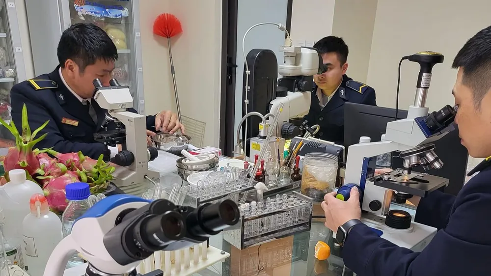 Cán bộ Chi cục Kiểm dịch thực vật vùng 7 (Bộ NN-PTNT) tại TP Lạng Sơn kiểm tra các mẫu trái cây trước khi thông quan
