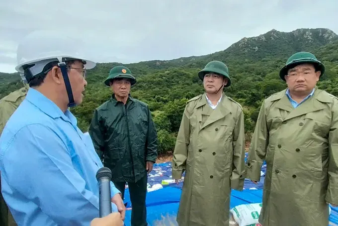 Bí thư Tỉnh ủy tỉnh Khánh Hòa Nghiêm Xuân Thành (thứ hai từ phải qua) kiểm tra công tác khắc phục sự cố xói lở thân đập hồ thủy lợi Nước Ngọt