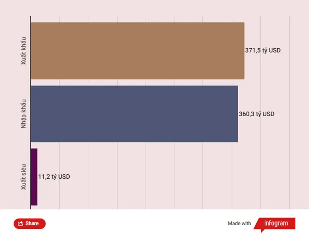 Nổi bật là xuất nhập khẩu tiếp tục tăng trưởng, lập kỷ lục mới với tổng kim ngạch đạt khoảng 732 tỷ USD, duy trì xuất siêu năm thứ 7 liên tiếp, đưa Việt Nam vào nhóm các nền kinh tế hàng đầu về thương mại quốc tế. Trong số đó, xuất khẩu tăng 10,5%, đạt khoảng 371,5 tỷ USD, hoàn thành vượt mức chỉ tiêu kế hoạch được Quốc hội và Chính phủ giao.