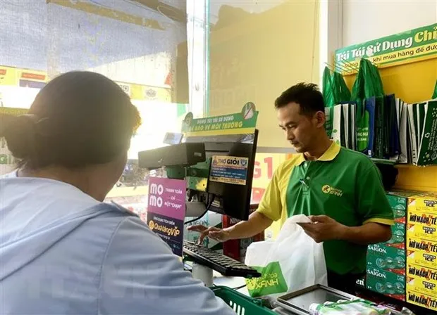 Nhân viên Bách Hóa Xanh xuất đơn hàng qua app cho khách hàng. (Ảnh: Hồng Đạt/TTXVN)