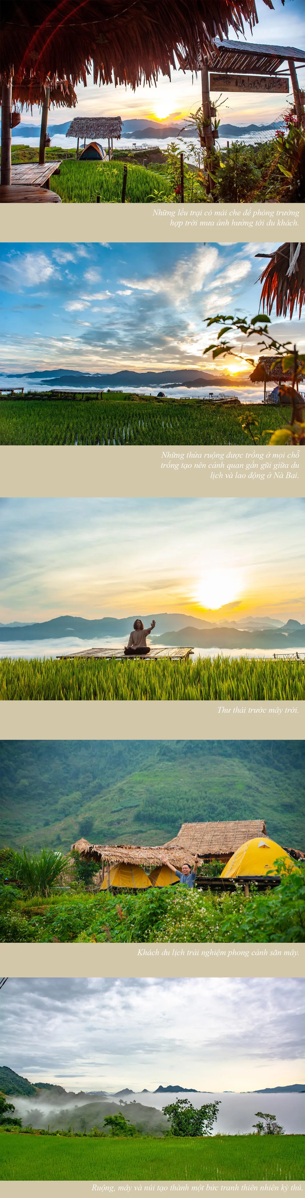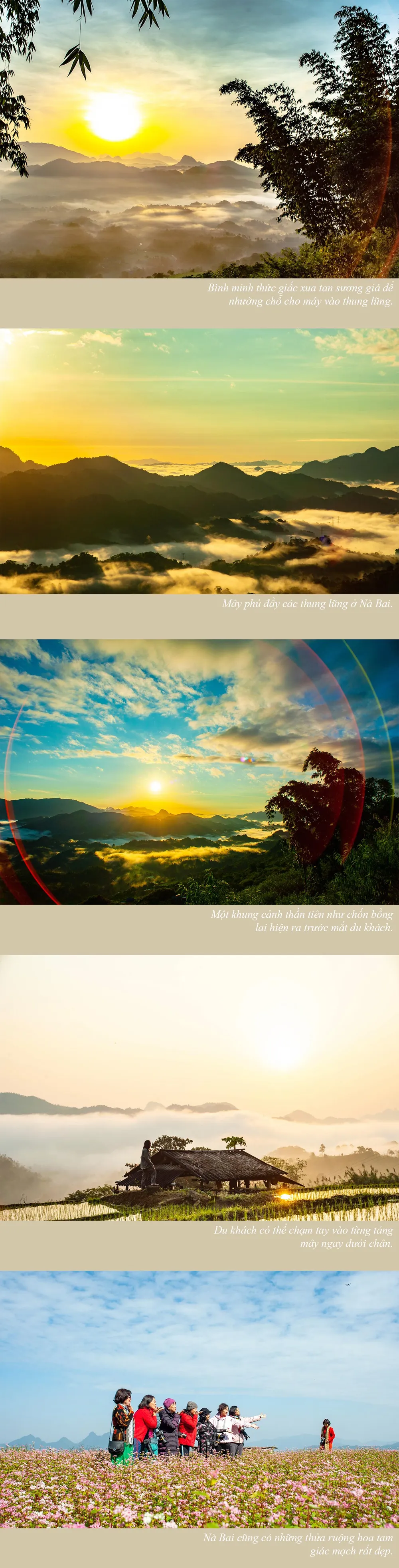 Khi du khách tỉnh giấc trong lều trại cũng là lúc ánh bình minh đang ló rạng. Tận hưởng cảm giác đón bình minh tại Nà Bai và ngắm mây buổi sớm, anh Lương Đình Khoa, du khách đến từ Hưng Yên, chia sẻ: “Ánh nắng bình minh tỏa sáng trước trùng điệp núi non, sưởi ấm sau một đêm nhiều sương giá. Lúc sương tan rẽ lối, mây như đang chảy vào thung lũng, xung quanh là những đỉnh núi trập trùng, phía dưới còn có những người nông dân đang cần cù gieo cấy, tạo nên một bức tranh thiên nhiên tuyệt đẹp. Mây lấp đầy các thung lũng rồi nằm im như đống bông tơ trắng muốt, cảm giác như ta có thể vớt mây thả vào trong chén trà, nhâm nhi buổi sáng sớm. Thật là một khung cảnh hữu tình nên thơ”.