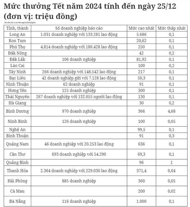 Các tỉnh Bình Dương có mức thưởng Tết Nguyên đán cao nhất 366 triệu đồng/người thuộc về DN có vốn đầu tư nước ngoài; mức thưởng bình quân là 6,8 triệu đồng/người, thấp nhất 4,68 triệu đồng/người đối với lao động làm từ đủ 12 tháng. Tỉnh Hưng Yên có mức thưởng Tết cao nhất 300 triệu đồng/người, thấp nhất 300.000 đồng/người. Sở LĐTB&XH tỉnh Lào Cai cũng đã có báo cáo về thưởng Tết Dương lịch 2024. Mức thưởng Tết Dương lịch cao nhất là 100 triệu đồng/người, thấp nhất 200.000 đồng/người. Mức thưởng Tết Nguyên đán Giáp Thìn cao nhất 100 triệu đồng/người, thấp nhất 500.00 đồng/người.