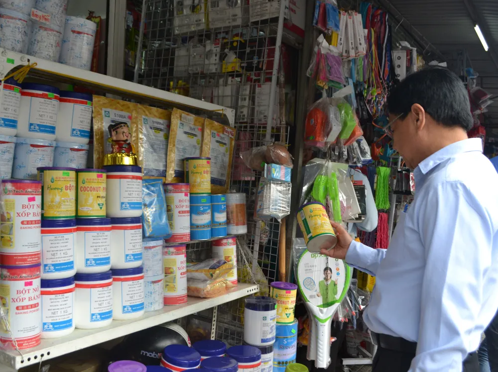 Lực lượng chức năng kiểm tra một cửa hàng kinh doanh hương liệu, phẩm màu tại chợ Kim Biên, TPHCM