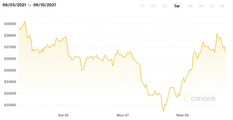 Giá Bitcoin đã tăng từ 36.304 đô la vào lúc 16:15 chiều 10/6 lên 38.200 đô la vào lúc 17:45 chiều 10/6 VN, tăng 5,2% trong vòng chưa đầy hai giờ dựa trên dữ liệu CoinDesk 20. Bitcoin sau đó mất giá, xuống còn 36.732 đô la vào 4 sáng 11/6.