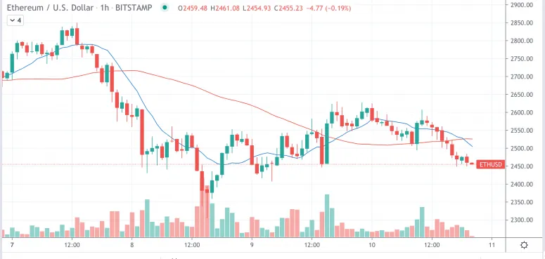 Tiền điện tử lớn thứ hai theo vốn hóa thị trường, ether, đang giao dịch quanh mức 2,465 đô la vào lúc 21:00 UTC (4:00 sáng 11/6 VN), tăng 3,8% so với 24 giờ trước. Tài sản nằm dưới đường trung bình động 10 giờ và 50 giờ, một chỉ báo giảm giá cho các nhà kỹ thuật thị trường.