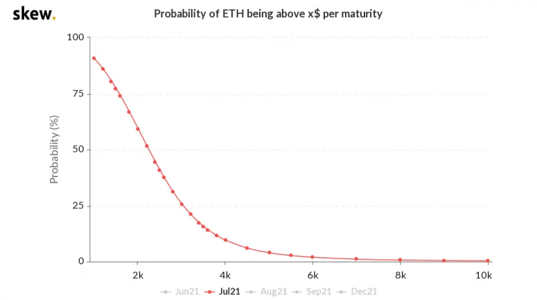 Xác suất cho giá giao ngay của ETH vào ngày 21 tháng 7 hết hạn dựa trên quyền chọn kỳ vọng 44% cơ hội Ether trên $ 2.400, 31% khả năng trên $ 2.800 và chỉ có 21% kỳ vọng Ether giao ngay trên $ 3.200 vào thời điểm đó.