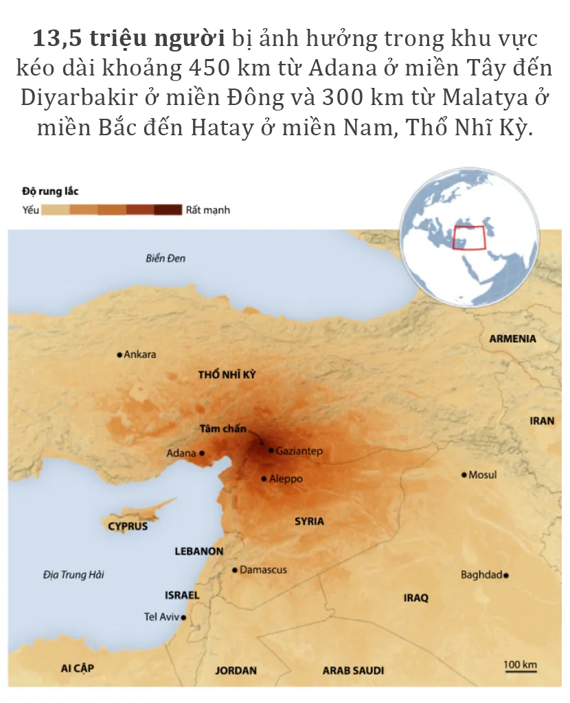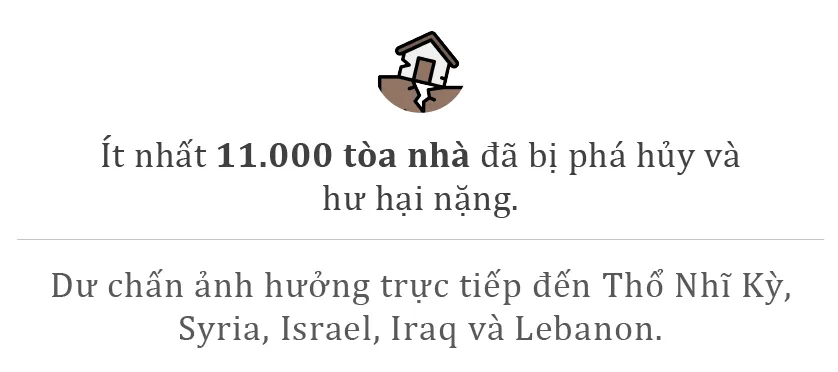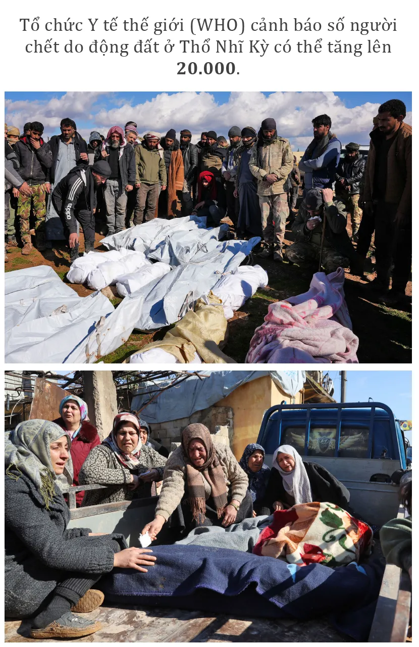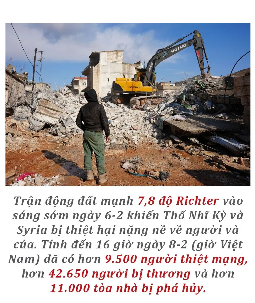 (ĐTTCO) - Trận động đất mạnh 7,8 độ Richter vào sáng sớm ngày 6-2 khiến Thổ Nhĩ Kỳ và Syria bị thiệt hại nặng nề về người và của. Tính đến 16 giờ ngày 8-2 (giờ Việt Nam) đã có hơn 9.500 người thiệt mạng, hơn 42.650 người bị thương và hơn 11.000 tòa nhà bị phá hủy. WHO cảnh báo, số người thiệt mạng có thể lên đến 20.000.