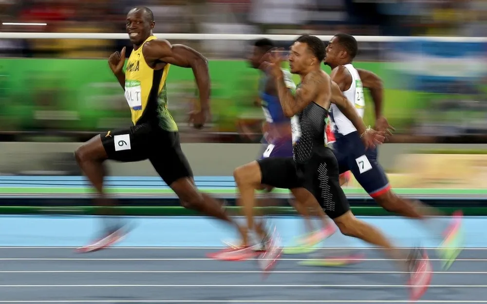 Trong vòng thi bán kết tại Thế vận hội Olympic 2016, nụ cười của ngôi sao điền kinh người Jamaica Usain Bolt trở thành tâm điểm của cả thế giới. Phóng viên Cameron Spencer của Getty đã ghi được khoảnh khắc "Tia chớp" cười khi quay mặt về phía ống kính và đang dẫn đầu đường đua. Bức ảnh thể hiện sự tự tin của ngôi sao người Jamaica.