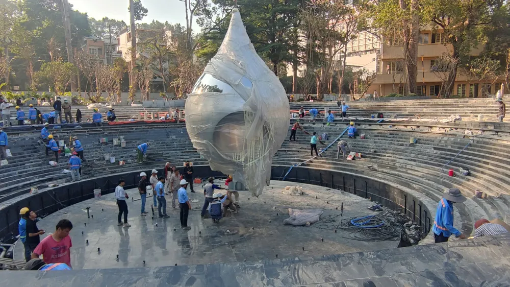 Ngày 2-2-2026, các đơn vị thi công đã hoàn tất việc lắp đặt tượng đài “Giọt nước” - biểu tượng trung tâm của công viên tại vị trí hồ nước của quảng trường chính.