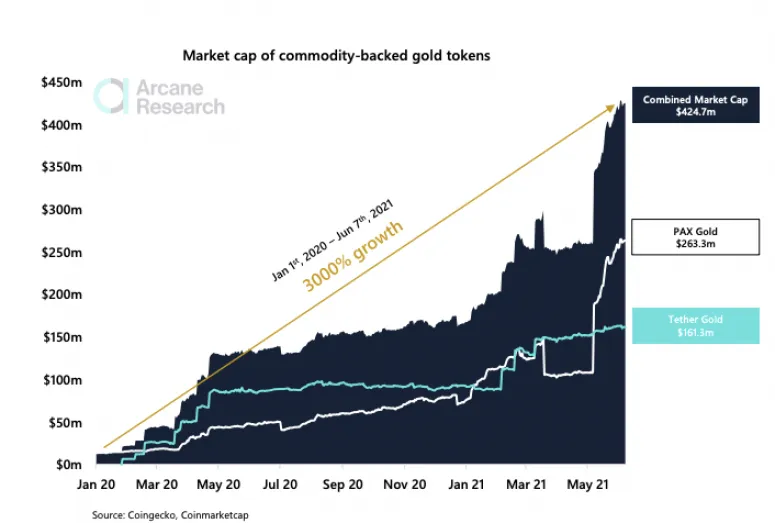 Theo dữ liệu do Arcane Research tổng hợp, tổng vốn hóa thị trường của các token được hỗ trợ bằng vàng đã tăng gấp 30 lần kể từ đầu năm 2020, phản ánh sự gia tăng nhu cầu.
