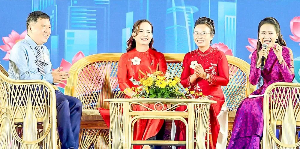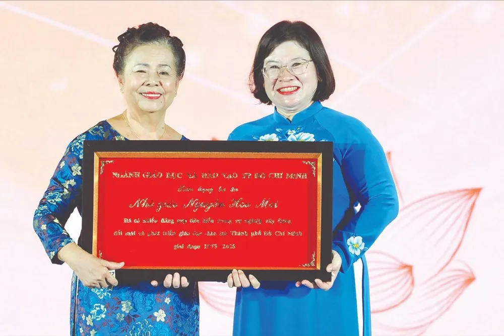 Phó Bí thư Thành ủy TPHCM Văn Thị Bạch Tuyết tôn vinh bà Nguyễn Hoa Mai, một trong 50 Nhà giáo tiêu biểu trong sự nghiệp xây dựng, đổi mới và phát triển GD-ĐT TPHCM giai đoạn 1975-2025