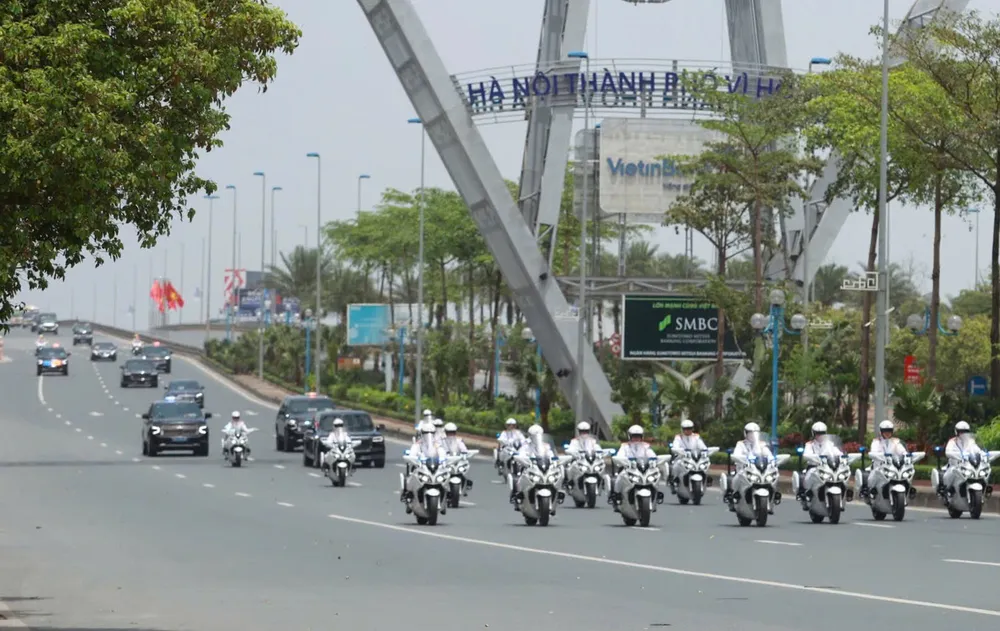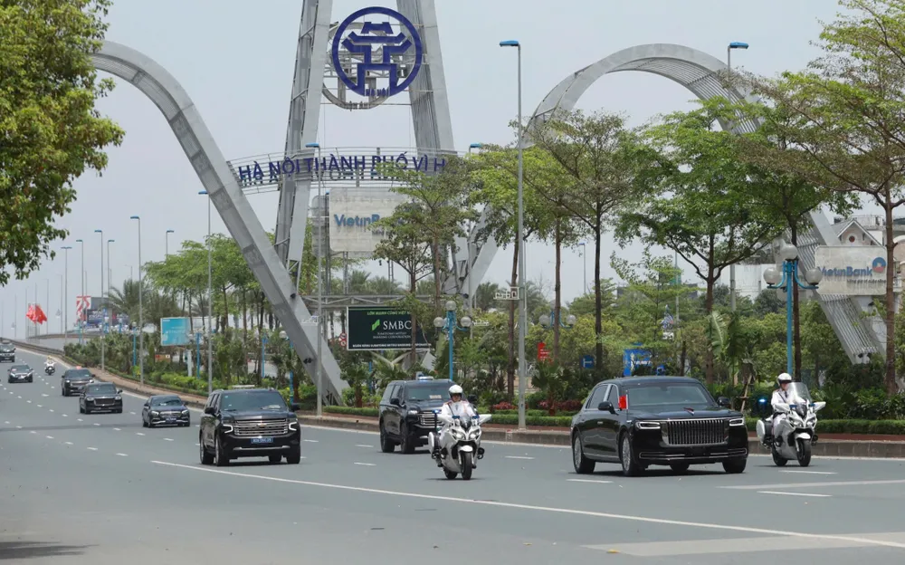 Đoàn xe chở Tổng Bí thư, Chủ tịch Trung Quốc Tập Cận Bình di chuyển trên đường Võ Chí Công, quận Tây Hồ, Hà Nội. Ảnh: VIẾT CHUNG